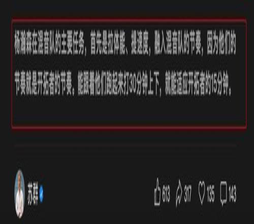 苏群老师说:“杨瀚森在混音队的主要任务,首先是拉体能、提速度,融入混音队的节奏,因为他们的节奏就是开拓者的节奏。能跟着他们跑起来打30分钟上下,就能适应开拓者的15分钟。”