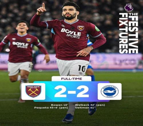 此役主场对阵布莱顿,帕奎塔在上半场助攻鲍恩破门,随后自己主罚点球破门,帮助西汉姆联最终2-2战平对手。