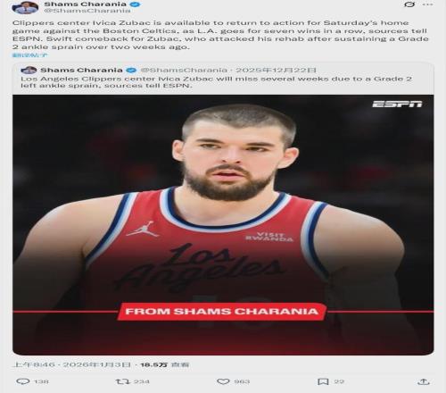 去年12月21日,祖巴茨在对阵湖人的比赛中遭遇脚踝二级扭伤,预计休战2周。