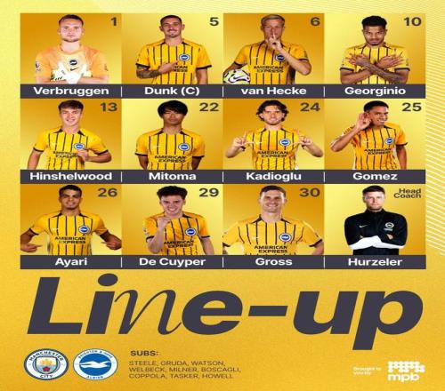 布莱顿首发:1-巴尔特-费布鲁亨、24-卡迪奥卢、5-邓克、6-范黑克、29-德克伊珀、10-吕特、13-杰克-欣谢尔伍德、25-迭戈-戈麦斯、26-亚辛-阿亚里、22-三笘薰、30-格罗斯