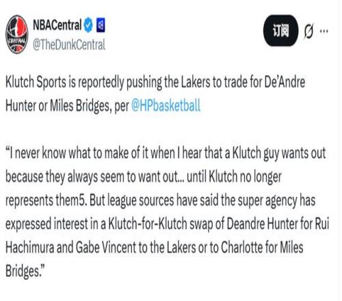 Hardwood Paroxysm写道:“每次听到Klutch旗下的球员想要离队,我都不知道该作何感想——他们似乎总嚷嚷着要走……可直到Klutch不再代理他们的合约,这种声音就消失了。不过据联盟消息源透露,这家顶级经纪公司已表达了交易意向,希望促成一笔‘Klutch内部球员互换’:要么将德安德烈-亨特送至湖人,换取八村塁和加布-文森特;要么用同样的筹码,向夏洛特黄蜂队交易迈尔斯-布里奇斯。”