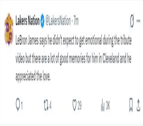 在洗完澡后勒布朗接受了采访,他谈到骑士主场为他播放致敬视频:在观看致敬视频时,我自己也没想到自己会如此动情,但我在克利夫兰有很多美好的回忆,我很感激骑士对他的这份关爱。